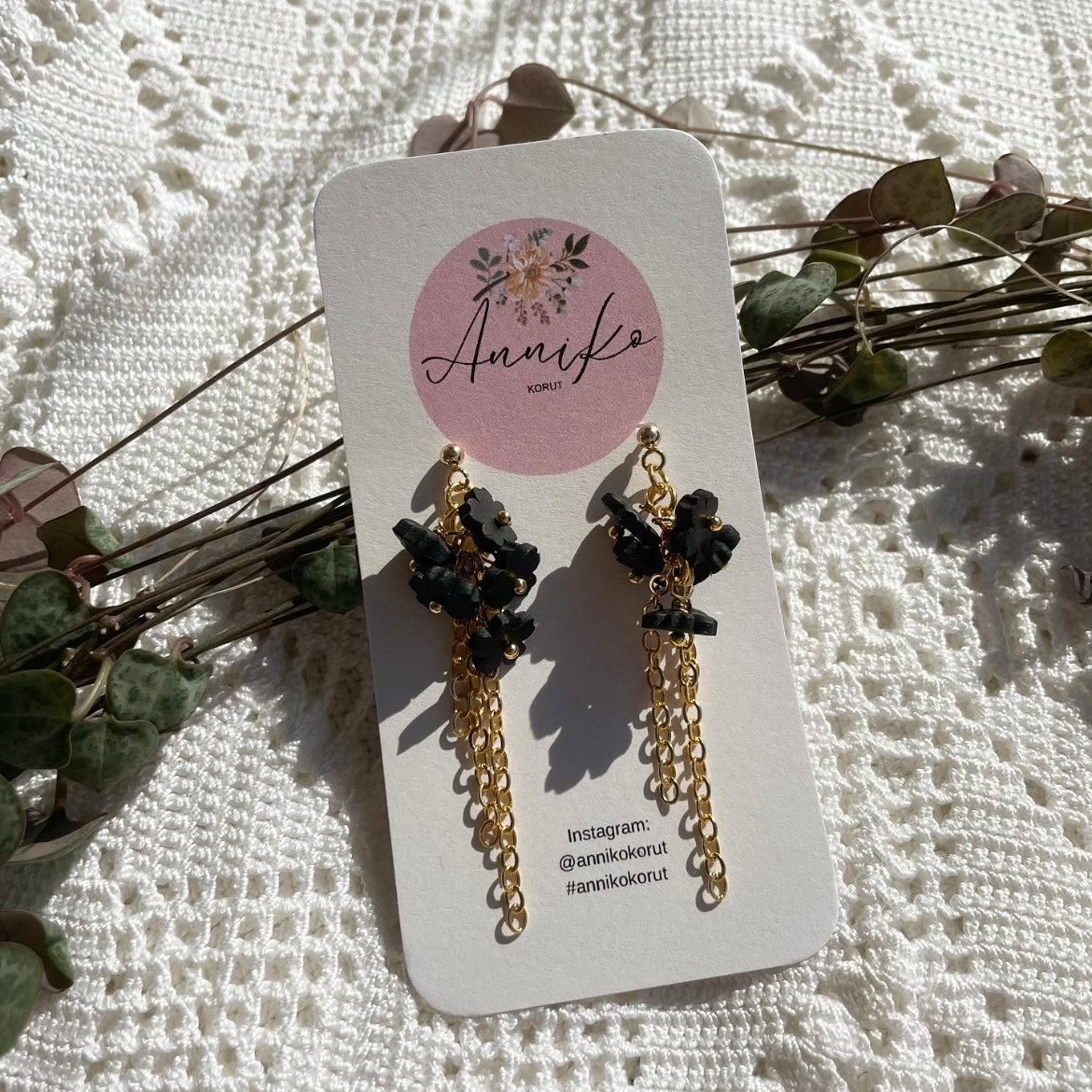 Kullattu nappikiinnitys, kullatut ketjut sekä polymeerimassasta valmistetut kukat.